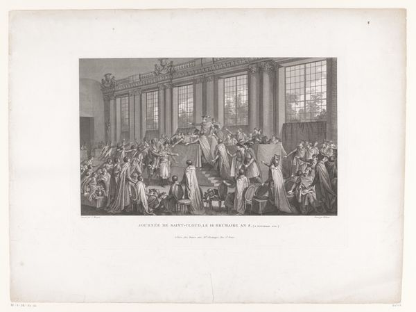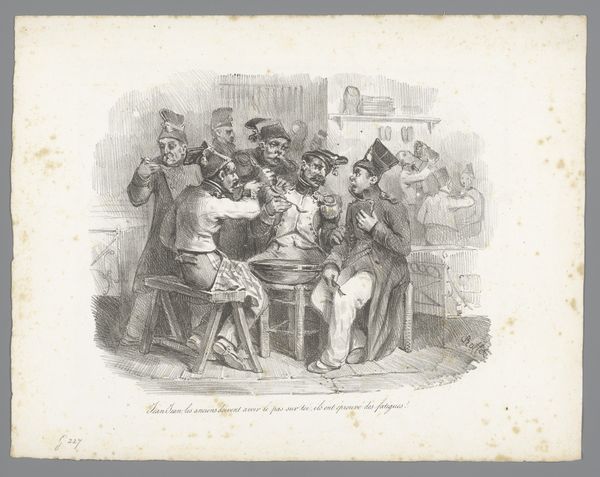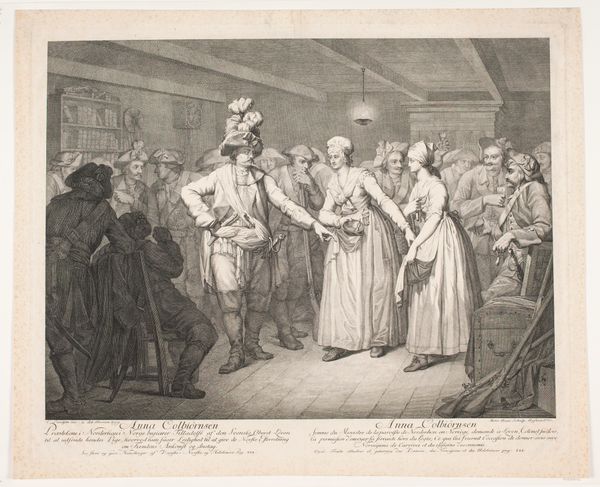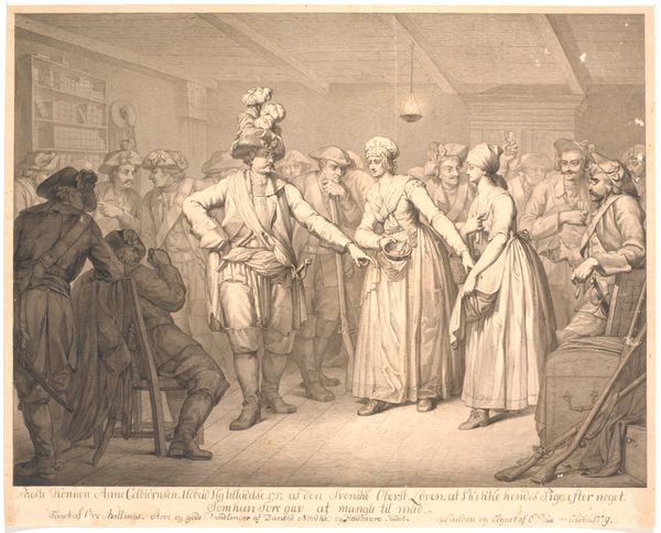 Editor: This lithograph, "Golden Wedding after the Lifting of Serfdom" from 1839, showcases a bustling domestic scene. The celebratory atmosphere is palpable. What social dynamics do you see at play within this gathering? Curator: This piece reflects a significant socio-political shift. The lifting of Stavnsbåndet—the serfdom act in Denmark—had a profound impact on peasant life. Artists at the time like to showcase these intimate scenes to depict a golden age, and even serve as propaganda for a rising merchant class. But who is truly at the center of the gathering in this image? Is it about pure joy, or about something else? Editor: I suppose I hadn't thought about the possible underlying purpose of depicting only the joy, rather than an objective account. Perhaps a touch of nationalism or a promotion of rural stability? Curator: Exactly. It invites questions. Is the family depicted a reflection of true emancipation, or is it presenting a curated narrative for a particular audience, cementing a political ideal through art? How might this image have functioned within the broader social discourse of 19th-century Denmark? Editor: That's a crucial consideration – how the image *functions*. So it’s not just *what* is depicted, but *why* and *for whom*. Curator: Precisely. And the "for whom" directly shapes the "what". This perspective also forces us to re-examine our relationship to images today, and whether art can truly be "apolitical." Editor: That's a really insightful point! It makes you consider the potential messaging and who the target audience may be, it provides a great framework. Curator: Indeed. It's about unraveling the intended, and sometimes unintended, narratives embedded within. Thank you for helping explore that with me.