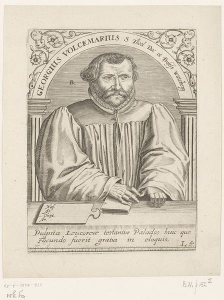 This is a small portrait of Canis Scaliger, made by an anonymous artist using engraving techniques. Look closely, and you’ll see how the image is entirely constructed from lines, etched into a metal plate. Think of the labor involved in manually creating each of these marks! The lines are cross-hatched to create areas of shading, giving a sense of volume to Scaliger's face and clothing. The engraver would have used specialized tools to achieve this level of detail, demonstrating mastery over the intaglio process. Engraving has a long history, dating back to antiquity. It’s a reproductive medium that allowed for the wide distribution of images. So, while this may seem like a straightforward portrait, it's also a testament to the power of printmaking in disseminating knowledge and ideas. It invites us to consider the skilled labor involved in its production, and how this craft has shaped our visual culture.