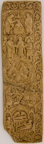 Curator: Let's explore "Leaf of Diptych: Consul Areobindus," an ivory carving from the Harvard Art Museums. The artist is unknown, but it offers a fascinating glimpse into Late Antique political imagery. Editor: It strikes me as powerfully hierarchical. Look how the central figure dominates the composition, elevated above everyone else, both literally and visually. Curator: Absolutely. The ivory material itself speaks to elite patronage and power. Consuls like Areobindus commissioned these diptychs to celebrate their office and distribute them as political gifts. Editor: I'm drawn to the dynamism of the lower register, those figures wrestling with lions. The contrast between the static, almost iconic, upper portion and the energetic lower section is remarkable. Curator: That interplay reflects the consul's role: both the embodiment of authority and the provider of spectacle for the populace, demonstrating his largesse. Editor: Thinking about composition and the interplay of form helps clarify its meaning. Curator: Considering the role and context helps us to unpack the symbolism here.