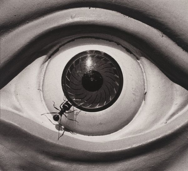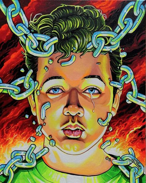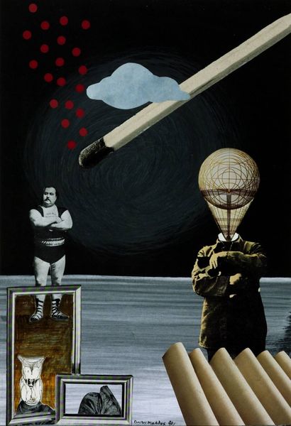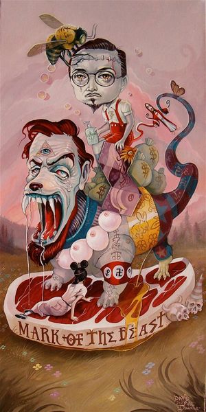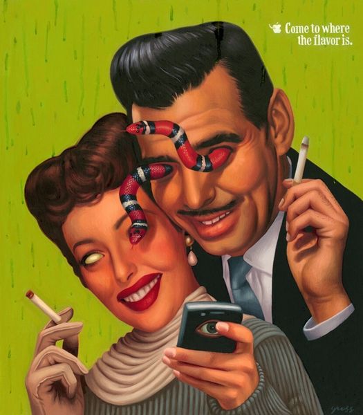 Editor: Alex Gross's painting "Volcom" presents us with such a bizarre portrait. The disembodied eyes on stalks emerging from the subject's eye sockets are immediately unsettling, juxtaposed with the stoic expression of the main figure and the unsettlingly direct stare from the girl in the background. It feels simultaneously political and absurd. How do you interpret this work? Curator: It’s fascinating how Gross uses the visual language of surrealism to tap into our collective anxieties and memories. Eyes are a potent symbol; they can represent knowledge, surveillance, or even the soul. Here, the snake-like stalks evoke temptation, perhaps manipulation, linking back to ancient mythological associations. Editor: So, are you suggesting that these eye-snakes imply manipulation and deception? Curator: Precisely. Consider how Gross subverts traditional portraiture. The Volcom logo suggests consumerism and maybe even conformity. Combined with the imagery surrounding sight, are we being told something about what – and how - we choose to see, consume, and believe? Editor: That's a powerful reading! I hadn’t connected the logo so directly. Is the presence of a young girl meant to communicate an added message? Curator: Yes. Her watchful gaze brings the themes of generational memory and the transmission of values or perhaps trauma into play. The portrait moves beyond a representation of a single individual and turns into a larger commentary on societal conditioning. It uses disturbing imagery to ask: What vision are we passing on? Editor: It is interesting how Gross employs potent symbolism to evoke those cultural undertones and prompt those inquiries concerning cultural memory. Curator: Precisely, these unsettling symbols really lodge themselves in the viewers consciousness.