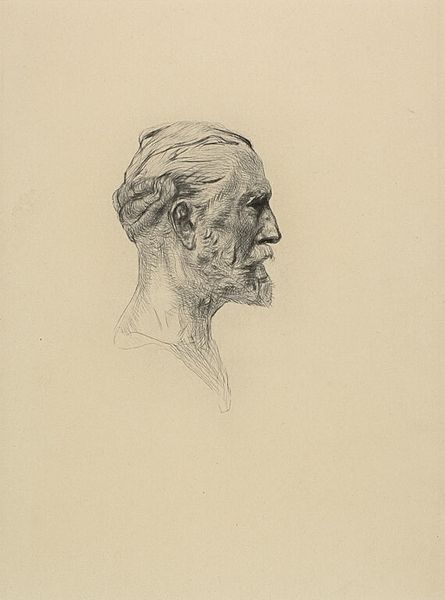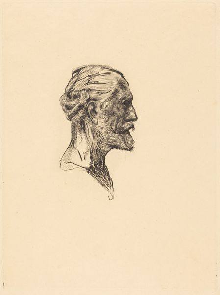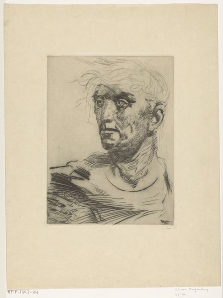 Curator: I find the mood in Willem van Konijnenburg's "Portret van een onbekende man" incredibly somber, almost meditative. Editor: And this print, an etching most likely created sometime between 1878 and 1943, invites a particular consideration of its making. Look closely at those incredibly fine lines, achieved through acid-etching a metal plate. How does this method influence our engagement with the portrait? Curator: Well, etching, unlike say lithography, has a history intertwined with the artisanal. These marks speak to a painstaking labor, not a mechanical reproduction. Also, in many institutional settings, drawing used to be deemed critical practice to become better painter/sculptor. We can think of the portrait as a record, as a practice. It reminds us the studio context as a learning site. Editor: Exactly! And observe the use of line—sparse, yet deeply expressive. Each stroke feels deliberate, revealing both the skill of the artist and the vulnerability of the medium. How might the choice of such an exacting process reflect or comment on the identity, or lack thereof, in the title, of the 'unknown man?' Curator: Perhaps Konijnenburg is interrogating ideas of identity, class and the very mechanics of portraiture itself. I am tempted to consider this work by association. It’s a portrait made through etching which in essence questions conventional markers of the upper class sitters of the tradition, through making. In other words, making has the political force here. Editor: But how does this piece function as a public artwork? I'm also thinking about how art history as a discipline shapes the perception of etching in particular. Often labeled 'minor art,' printmaking's cultural worth continues to be debated within larger institutional value systems. What are your thoughts? Curator: These labels and hierarchies are exactly what this artwork challenges. By choosing etching, traditionally associated with craft, and creating a fine art portrait, Konijnenburg blurs those artificial boundaries, democratizing the medium. It compels us to confront our own assumptions about value and artistry, both within and outside the gallery walls. Editor: I see it now. Curator: It seems this artwork challenges our ingrained cultural norms associated with portraiture—from status and power, to labor and art.