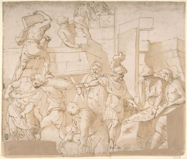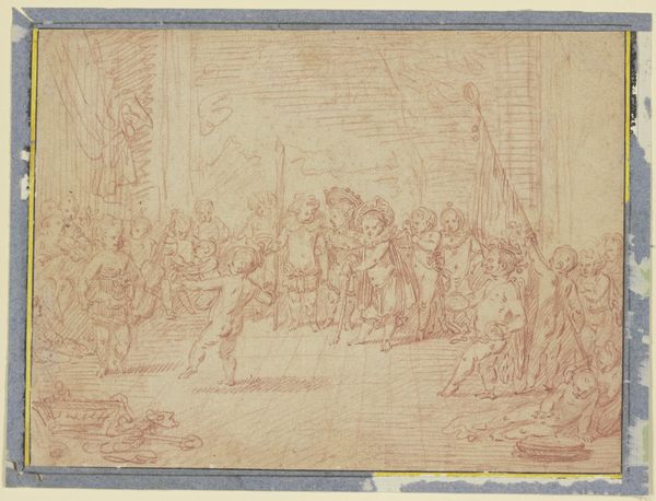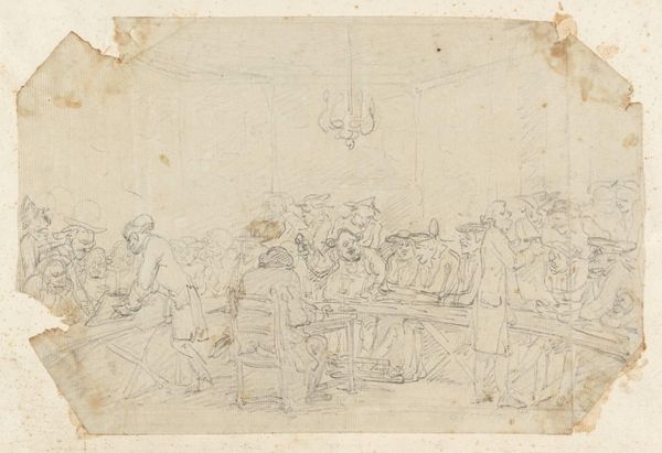 Curator: "Interieur met vrolijk gezelschap rond een tafel," or Interior with Merry Company around a Table. This lively ink drawing is attributed to Willem van Herp the Elder and was likely created sometime between 1624 and 1677. What impressions does it leave on you? Editor: Oh, total mayhem! It’s like everyone's having a blast— glasses raised, some kind of embrace happening on the right, and a general atmosphere of, well, merriment! The frenetic linework gives it such a sense of movement, like catching a fleeting glimpse of a party. Curator: The energy definitely radiates. Van Herp captured a key element of Baroque sensibilities, where celebrations, feasts and communal experiences spoke volumes. If we unpack this ‘merry company,’ we notice a gathering arranged carefully according to societal positions. What unspoken truths, maybe even rules, dictated that staging? Editor: Staging...yeah, like the people at the ‘head table’ and then there’s that figure down front attending to the drinks with the cute little dog sniffing around! I suppose you see hierarchies reflected in all the little details—it makes me think, is the chaos intentional, a sign of wealth, a flaunting, almost, in its sheer excess? Curator: That's astute. Social order was maintained via performances of hierarchy at play within intimate spaces of relative freedom. Van Herp gives us an allegory for this. It also reflects genre paintings becoming popular during the period. Through these domestic interiors, we gather clues, reinforcing or subverting familiar moralistic messages and values. Editor: So beneath the veneer of the joyful gathering, there's possibly a warning about the pitfalls of excessive indulgence? Maybe the dog hints at fidelity, or the discarded objects carry some symbolic weight about temperance and moderation? It’s so interesting to see it this way! Curator: Exactly. What Van Herp accomplished brilliantly through fluid strokes is the subtle interplay of social messaging using allegorical imagery and established cultural metaphors. This is one method how cultures remember what their communities should value. Editor: That's the amazing thing, isn’t it? How much can be conveyed through what, at first glance, seems a simple drawing of a party? Next time I'm invited somewhere, I might bring my iconographer glasses... just in case.