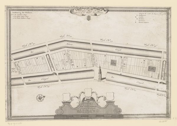 Curator: Looking at this piece, the immediate impression is of organized labor—an almost unsettling level of precision. Editor: That's an interesting take. What strikes me is its historical value as a document. We're looking at a print from 1727, titled "Plattegrond van de Compagnietuinen te Kaapstad"—essentially, a map of the Dutch East India Company's gardens in Cape Town. Curator: Right. So much can be discussed on the level of production! Think of the engraver meticulously transferring the garden plan onto the copper plate. The skill required, the labor involved, is quite evident. The sharp lines, uniform shapes. Editor: Precisely. The Dutch East India Company held immense power, and this garden represents their attempt to control and cultivate not only the land but also resources, including food and medicinal plants, in this new territory. Its geometrical layout embodies that colonial control, creating visual order amid potential chaos. Curator: It's about making nature predictable, right? I mean, look at these rigorously organized plots. Each one contains different crops—I notice cabbages, legumes and onions listed along the border. The entire scene highlights a planned and rational manipulation of nature for commodity production. Editor: Yes, a space of vital economic and social importance! It speaks to Dutch colonial ambition, illustrating their commitment to transforming Cape Town into a provision station that serves their trade routes. Curator: I wonder how many workers—slaves, most likely—toiled in these gardens. The engraving only offers the blueprint; the reality would involve forced labor to render this ideal manifest. The lack of human presence here ironically speaks to this oppressive system. Editor: Exactly. The map highlights power dynamics—those who planned and controlled the garden versus those who physically maintained it. Furthermore, distributing this image would bolster this claim and sense of authority and power. Curator: In conclusion, beyond the clean, geometric aesthetics of the Dutch Golden Age style and precision inherent in the engraving medium, the work provides much insight to consider when thinking about how landscapes of production relate to a society's colonial expansion and ambitions. Editor: Absolutely. This image reveals so much about the interwoven politics of resources and representation, while raising awareness of colonial practices that deeply transformed Cape Town.