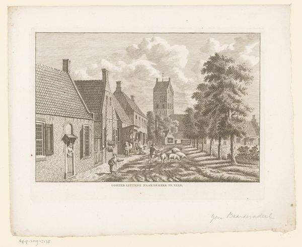 Carel Frederik Bendorp created "Dorpsgezicht te Winsum," an etching, using lines to define the shapes of buildings, trees, and figures, crafting a coherent and serene village scene. The linear structures create a sense of depth and perspective, inviting the eye to traverse the composition from the detailed foreground to the softer background. Notice the use of line to suggest texture and form, particularly in the foliage and the brickwork of the buildings, indicating a structured yet intimate portrayal of rural life. The orderly arrangement of houses and the natural elements reflect the artistic interests of the period. It presents a harmonious relationship between human construction and the environment. The composition invites contemplation on the interplay between structure and nature, suggesting a dialogue that transcends mere representation. The lines invite us to consider the balance between the constructed and the organic, and how this artistic choice reflects broader cultural values and aesthetic principles.