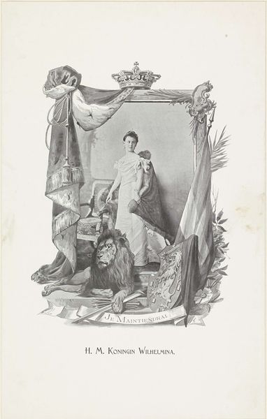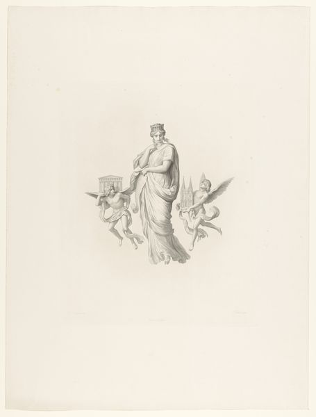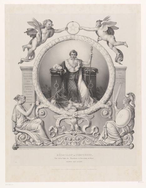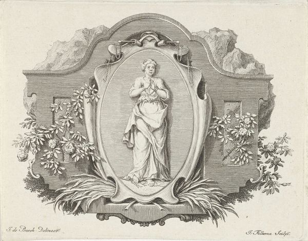 Curator: This print is a portrait of Joost van den Vondel. It was created sometime between 1847 and 1883 by Frits Ohrloff and uses engraving as its primary medium. Editor: Gosh, it feels so... distant. He’s sitting on a tiny stool, kind of precarious, in the middle of a blooming picture frame, or an archway… is it meant to feel reverential? A little stiff? Curator: Well, consider that this image exists within a long lineage of historical representations. Vondel, a towering figure in Dutch literature, is deliberately framed to evoke a sense of national pride. Think of it in terms of performative nationhood—how individuals become symbols. The academic style lends him authority. Editor: Authority, sure, but at what cost? Doesn’t the engraving, all those meticulous lines, feel… confining? Where's the fire in the poet's eyes, you know? It's almost as if the frame and historical significance suffocate any sense of human spontaneity. Maybe it’s intentional, creating an icon instead of an accessible human being. Curator: But the intent matters. These portraits contributed to the construction of national identity, representing him in a way to align with national values and history painting which has become quite a prominent theme, particularly figuration during that time. To look critically also requires acknowledgement of these formative efforts, placing Vondel’s contribution centrally. Editor: I see that and appreciate the historical context that provides to the subject, it's the feeling that it conveys... something just makes it seem distant and untouchable in an isolating sense. Almost as if Vondel is now part of the history books as if his work isn't to be experienced... but academically understood. It lacks joy, it lacks accessibility! Curator: Ultimately, that tension highlights the complexity of portraying historical figures. We balance honouring legacy and risking sanitisation. Editor: Yeah, it’s definitely got me thinking about how we choose to remember – and who gets remembered!