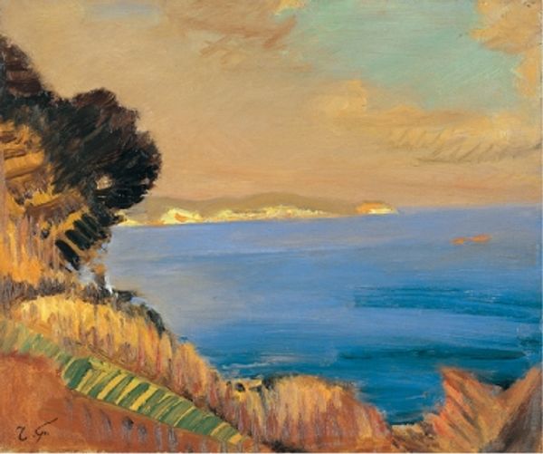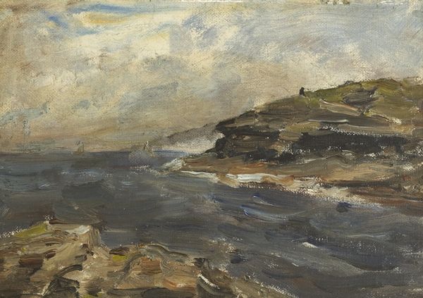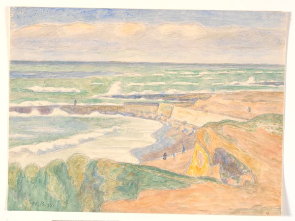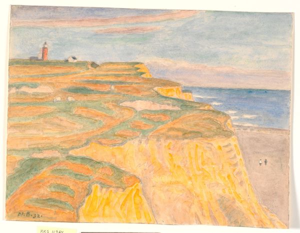 Editor: This lovely watercolour by Niels Bjerre, *Skrænter ved Bovbjerg* from 1932, it just breathes quiet contemplation. The muted colours, the vast sky... it makes me feel rather small. What do you see in this piece? Curator: The enduring allure of the landscape lies in its symbolic resonance. Think of the cliff edge here – a liminal space. What feelings arise when you look at edges, frontiers? The coast itself signifies transition, between the known land and the vast unknown. Bjerre uses these visual cues. Editor: Transition… I see that. The building feels like the known world, stable, and the sea…possibilities? Or dangers? Curator: Both, surely. In art, symbols rarely carry a single meaning. Consider the high horizon. What might it suggest, psychologically, to minimise the earth in favour of an expansive sky? Editor: Maybe… a sense of freedom? Of the infinite? It contrasts so much with the solid ground. Curator: Precisely! And observe how the artist directs our gaze—leading us from the sturdy cliff to the mutable sea. Color and form aren't just descriptive, they conduct our emotions, subtly shaping our experience of the landscape. What continuities do you detect, in our current climate crisis, for example? Editor: That's fascinating. I hadn't considered the emotional power embedded in what I thought was just a pretty landscape! Curator: Exactly, this shows us the interplay of symbol, psyche, and place in visual culture, I learn from this all the time.