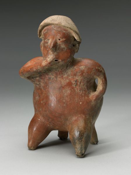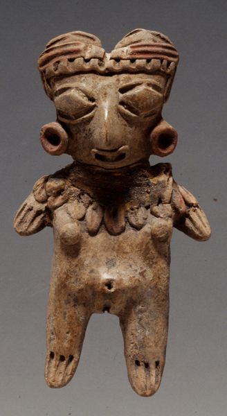 Editor: Here we have the "Female Figurine," crafted around 700 by the Tlatilco people. It’s a ceramic sculpture, currently housed at The Art Institute of Chicago. There's something very striking about its form—the almost exaggerated proportions create a unique sense of presence. How do you interpret this work, focusing on its formal qualities? Curator: Immediately, the bi-facial nature commands attention—the almost uncanny doubling of the head, bisected yet connected. It creates a dynamic tension, a visual rhyme that invites deep contemplation of symmetry and asymmetry. How does this doubling speak to the semiotics of the body itself? Editor: That's fascinating. I hadn’t really considered the duplication as significant beyond just visual repetition. What about the earthy tones and the smoothness of the ceramic? Curator: The medium of ceramic is crucial. Its inherent tactility implies a specific kind of sensory engagement. The smooth surfaces contrast with the textured detailing around the head, setting up another structural polarity that demands further inspection. We see here a triangulation of form. How might we understand its implications on social or cultural hierarchies and artistic techniques? Editor: The form and shape create almost an hourglass impression, and the visual dialogue sparks unique ideas of beauty standards that are challenged or championed depending on the individual. I see so many contrasts! What is one point or idea I should take away? Curator: The interplay of the figurine's elements underscores the piece’s engagement with structural principles, specifically semiotic interplay with balance to emphasize form. Through color, form, medium, we appreciate how art serves as medium to dissect meaning. Editor: It is wonderful to notice that by analyzing the structure of its creation that we discover an internal and deeply significant meaning.