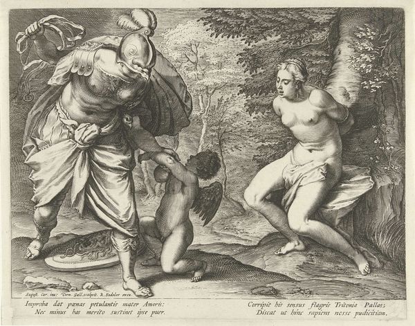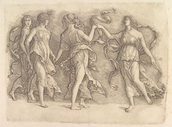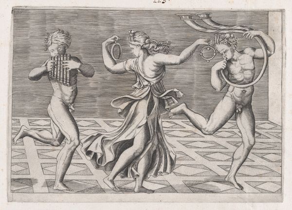 This print, "Dance of Fauns and Bacchants," was made using an engraving process; an anonymous artist cut lines into a metal plate, likely copper, with a tool called a burin. The incised lines hold ink, which is then transferred to paper under great pressure. The image, made up of tiny hatched marks, shows figures in motion: a piper, dancers, and what appears to be a small goat. The quality of the print relies entirely on the engraver’s skill, and the time taken to produce a delicate image. The print would have been relatively inexpensive to produce in multiples, and easy to distribute. Prints like this circulated widely, serving as a means of communicating classical aesthetics. The “Speculum Romanae Magnificentiae” was a project to document the wonders of ancient Rome, and this print reflects a broader interest in antiquity. We can consider this artwork as an explicit example of art's intersection with the economics of its time, challenging traditional distinctions between fine art and craft.