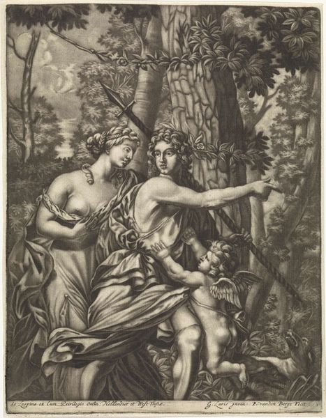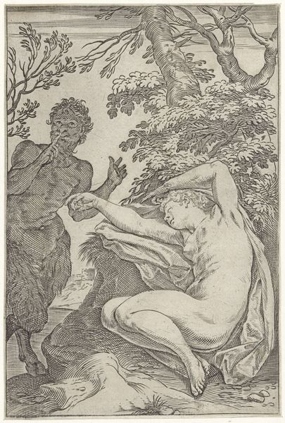 Curator: This engraving, titled "Adam and Eve," was crafted between 1586 and 1612, attributed to Cornelis Galle I. You can find it here at the Rijksmuseum. Editor: Immediately, what strikes me is how crowded it is! Adam and Eve are centrally placed, of course, but surrounded by animals and lush foliage…it feels almost claustrophobic despite being ostensibly set in paradise. Curator: Galle was quite meticulous, almost scientific, in depicting nature; the landscape acts not only as backdrop, but as active participant in the drama unfolding. Consider how the line work contributes to a sense of density, particularly around the serpent entwined in the tree. Editor: And what a serpent! Coiled dramatically, nearly regal, with a decidedly knowing glint in its eye. But look at Eve, her hand outstretched. She doesn't appear frightened or seduced, just…curious. What do you make of the subtle blurring around their forms? It softens the outlines, almost as if they're not quite real, or already fading from grace. Curator: A printing technique designed to guide the eye. But look closer: each element serves to emphasize the binary oppositions—knowledge versus innocence, human versus animal, paradise versus exile. Notice the rather imposing jaguar? An unusual and foreboding presence that adds to a symbolic interpretation of the piece, almost like an announcement that innocence will be short-lived. Editor: Exactly. While we're drawn to Adam and Eve, we cannot escape that looming feline presence. The contrast emphasizes this loss. There is the distinct feeling of being forced to leave the scene after the "forbidden" act, but not without feeling the urge to look over one's shoulder. In addition, I can´t help but wonder whether it´s meant as an invitation of an alternative world for these two innocent human beings. Curator: Yes, that feels right. So the narrative threads entwine, reflecting not just the moment of transgression but the complexities of its aftermath and, in essence, capturing the very essence of the human condition and, dare I say, human error!