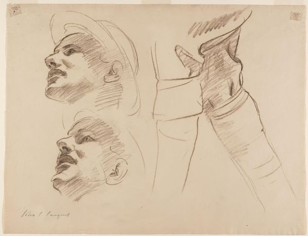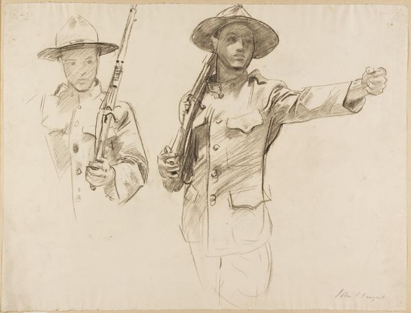 Editor: This is John Singer Sargent’s *Studies of Three Soldiers with Rifles, Left Arms Extended*, for "Coming of the Americans." It's a drawing, and I’m struck by the repetition of form and pose. What do you see in this study? Curator: The linear quality dominates. Observe how Sargent uses line to delineate form and create a sense of movement. The repetition you noted enhances the rhythm within the composition. Editor: It’s interesting how the slight variations in each figure change the overall feeling. Curator: Precisely. The subtle differences in pose and expression create visual interest and prevent the study from becoming monotonous. The arrangement of these figures showcases Sargent's mastery of visual dynamics. Editor: Thanks, I'm starting to appreciate the nuances in what seemed like a simple sketch. Curator: Indeed. Close attention to the formal elements reveals a deeper understanding of the artist's intent and skill.