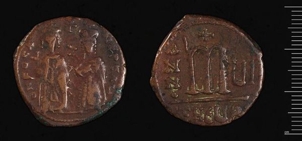 Editor: This is a coin of Phokas, whose reign seems lost to time, housed at the Harvard Art Museums. Its patina whispers stories. What secrets do you think it holds? Curator: Ah, a coin! A humble object, yet a portal to another age. Imagine the hands that touched it, the marketplaces it traversed. It speaks of power, doesn't it? The wear and tear, the almost ghostly images… Editor: Exactly! The ghostly images are what intrigue me most. Curator: Me too! Close your eyes and let your imagination run wild. Picture the emperor, his ambitions, the everyday life swirling around him. This coin, it's a little piece of that grand, messy human drama. Editor: I never thought about it that way before; it's like a time capsule in my hand. Curator: Precisely! Each coin offers a unique lens through which to view the past.