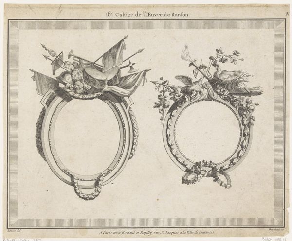 Pierre Gabriel Berthault created this print, "Medaillons met muziekinstrumenten en wapens," using etching. Considered within the social and political context of 18th-century Europe, these medallions, adorned with musical instruments, weapons, and floral arrangements, present an interesting visual study of power, culture, and artistry. France was a nation deeply involved in cultural refinement even while being steeped in political and social hierarchies. The combination of musical instruments and weapons invites us to think about the complex ways societies have historically balanced creation and destruction, peace and conflict. Who are the intended recipients of such imagery and what kind of message does it seek to convey? The aesthetic choices, such as the delicate floral decorations, might soften the impact of martial symbols, suggesting an attempt to integrate symbols of power with ideals of beauty and harmony. In contemplating this work, we might consider the emotional dimensions embedded in the display of such contrasting symbols.