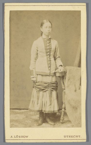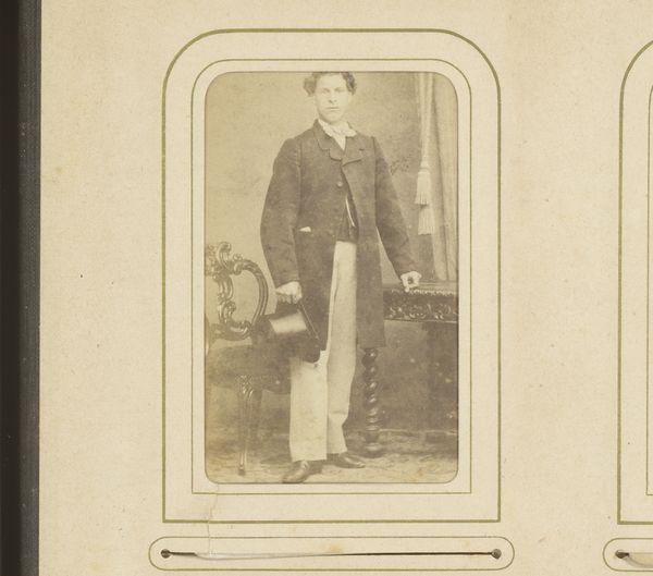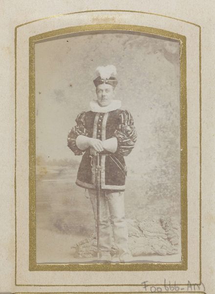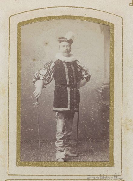 Curator: This striking image is titled “Portret van een (vermoedelijk) Italiaanse zoeaaf, staand” – “Portrait of a (Presumed) Italian Zouave, Standing”. It was taken sometime between 1861 and 1866 by Fratelli d' Alessandri. Editor: My first impression is how… stiff he appears. But there's something very intriguing in the materiality of this image, a play with soft focus that enhances details, like the stitching in his jacket or the tasseled sword. What were Zouaves doing in Italy then? Curator: The Zouaves were originally a unit of the French army, but other countries adopted the uniform and the concept. It’s fascinating, really, this man posing in what is essentially a readymade military identity. The image underscores the way national identities were being crafted and performed. Editor: Crafted is the right word. Look at how precise the photography is; it clearly seeks to emulate painting, even to mimic classical composition. It makes me wonder about the work that went into his uniform and his reasons to buy such photo from Fratelli d' Alessandri. Was he fighting for the Papal States? What motivated the production and the demand of these photographs? Curator: Yes, he most likely fought for the Papal States. It is known that many joined the Papal Zouaves who answered the Pope's call. His studio portrait served as both personal memento and propaganda. What it signals about the cultural significance of this moment of Italian unification cannot be understated. Editor: Agreed, it's a collision of cultural symbols. But getting back to craft, think about the photographer's labor. It must've been such an involving activity setting the subject up, ensuring everything was aligned, the light just so… The materiality really embodies its historical moment. Curator: Ultimately, this is not merely a snapshot of a man, but a visual condensation of the complex interplay of faith, identity, and military conflict within a specific historical juncture. Editor: I will certainly think about photography in terms of the global supply chain from now. There's also a beauty in the detail that goes far beyond capturing mere likeness. Thank you!