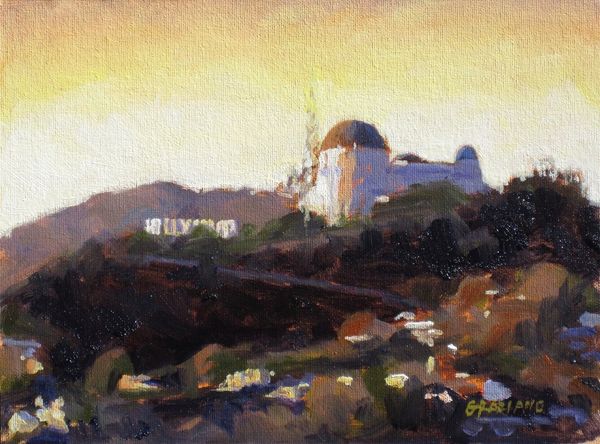 Dan Graziano captured this sun-drenched view of Los Angeles from the Griffith Observatory using oil on board. The observatory dome stands proudly, evoking classical temples of knowledge, while the city shimmers faintly in the distance. Consider how the dome, a symbol of enlightenment, echoes the Pantheon's dome, a celestial eye connecting earth to the heavens. The blue sky above, painted in broad strokes, is reminiscent of the vaulted ceilings of Renaissance frescoes, beckoning us to contemplate our place in the cosmos. Even the hazy skyline of Los Angeles is not without precedent. It recalls the romantic, often melancholic, cityscapes of the German Romantics, who saw the urban landscape as a mirror reflecting humanity's hopes and anxieties. The choice of rendering evokes an emotional connection that transcends the purely visual. These motifs—the dome, the city, the sky— resurface, evolve, and find new meaning across different historical contexts, revealing the cyclical progression of symbols in art and culture.