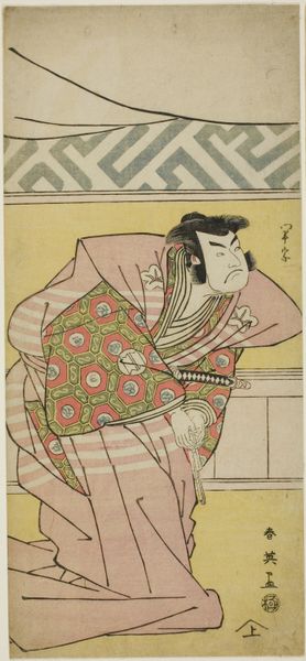 Editor: This woodblock print by Katsukawa Shun'ei, around 1790, portrays the actor Asao Tamejuro I. I'm struck by the starkness and detail; it almost feels like we're intruding on a very personal moment. How does this piece speak to its cultural context? Curator: Well, first, consider this artwork within the vibrant ukiyo-e tradition of Edo period Japan. Prints like these were incredibly popular, acting as a form of mass media depicting celebrities and popular culture. They show the public role of art in this period. Who are the "celebrities"? Editor: The actors! Curator: Precisely! The actor Asao Tamejuro I, playing Drunken Gotobei. What do you observe about how his role—and persona—is constructed in this image? Think about costume, posture, expression. Editor: His clothing is rumpled, he has stubble, a sword but no shoes, and he needs a walking stick. And his face is puffy. He definitely looks the worse for wear! Was this intended to be humorous? Curator: Potentially. And this print likely circulated among theatergoers, reinforcing Asao Tamejuro I’s popularity and promoting the play, and would've influenced the actor’s and audiences’ understanding of this character. Think about the relationship between the theatre, these prints, and the audience. Can you speculate on why actor prints were so popular? Editor: To own a piece of the spectacle, to keep the memory alive and to maybe even show support for a favourite performer? It seems to point to a really thriving performance culture. Curator: Exactly. These prints democratized access to celebrity. I hadn't thought of it quite like that, thanks for your perspective. Editor: It's been really insightful, looking at the art world not as something separate, but integrated with the day to day culture.