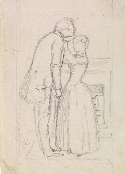 Curator: This subtle sketch, housed here at the SMK, offers a fascinating peek into the artistic process. It's Christen Købke's 1829 drawing, “Maleren C.D. Gebauer tegner for Jomfru Margrethe Hahn"—that's "The painter C.D. Gebauer drawing Miss Margrethe Hahn" in English. A snapshot, if you will, rendered in pencil. Editor: I find this instantly charming! It feels so intimate, like catching a private moment. There's a softness to the light and line work that makes it surprisingly tender, especially considering it’s just a sketch. Curator: Precisely. Köbke was a master of capturing the everyday, and it's amazing how much information he conveys with so few lines. What interests me most is how this image represents the power dynamics of the time. Gebauer, the established artist, and Hahn, the young woman being drawn. The gaze, the poses, even their relative positions within the composition tell a story. Editor: Yes, the composition is striking. Gebauer, turned away, absorbed, almost barricaded behind his table. And Margrethe, poised elegantly, yet somewhat passive, waiting for the artist's verdict. Do you think the lack of intense detail almost humanizes the subjects—keeps them available to us? Curator: That’s a very insightful observation! The drawing remains intentionally uncompleted, keeping this kind of dynamic fluid and unsettled. Consider also the function of portraits then, they weren't simply aesthetic objects but actively promoted the sitter’s social status. Who commissioned whom, was an active signifier of agency and capital. Editor: Absolutely, these things matter so much, particularly for the Hahn family. It feels unfinished but full of life. Köbke really allows us to participate, doesn't he? To ask ourselves questions about that dynamic—it could have been another artwork that rendered this moment with more ego! Curator: Exactly, and that invitation, that very opening up of possibilities, feels incredibly modern, wouldn't you say? We can consider its place in Romanticism, as well as seeing the way its visual language affects modern expectations of artist-muse relations. Editor: I agree. So it feels both anchored in its era and perpetually relevant. I'm always drawn to art that speaks to multiple conversations simultaneously—the technical virtuosity alongside the questions that trouble it. Curator: Well said. I think Købke manages to pull that off beautifully here.
