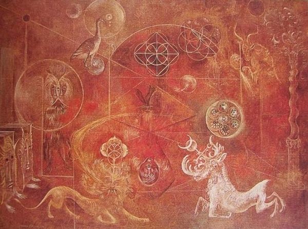 Curator: This is Leonora Carrington's "El Gato," painted in 1951, using oil on canvas. The painting seems to be illustrating a rather somber mood through the surrealist scene it illustrates. I'm curious about your perspective on it. What stands out to you? Editor: It’s definitely strange! I notice this striking contrast between the muted tones and the really bizarre figures she’s depicted, and the actual impasto. How might Carrington’s process and her choice of materials contribute to the overall effect of the work? Curator: That’s a really insightful observation. We can see the blending of fantasy with everyday resources; oil paint wasn't exclusively for "high art," right? The materials she chooses allow for the manifestation of dream imagery. The social context matters: Carrington had limited resources. How does this inform the types of canvases she chose to paint on? Are they reused canvases, or are they carefully chosen based on other external constraints? Editor: So you’re saying her choice of material might speak to some extent about constraints, perhaps reflecting her status or access at the time. Could the subject matter in "El Gato," the feline form, also challenge art traditions regarding the artist’s labor? Curator: Absolutely! Think about what was acceptable. Does she challenge traditions? The cat may be representative of something larger here. Look at it within the lineage of animal representation in art history, and consider her individual labor to create something so fantastic in post-war Mexico. The material application creates layers both literally and conceptually. What labor and context does that suggest to you? Editor: I see your point. It is interesting to think of surrealism not just as fantasy, but connected to tangible constraints. So it brings this conversation to art, making and her labor, not just about her creativity but about production, and that's eye-opening for me. Thanks! Curator: Indeed. Focusing on materials and production allows us a grounded entry into understanding such a seemingly bizarre and otherworldly picture.