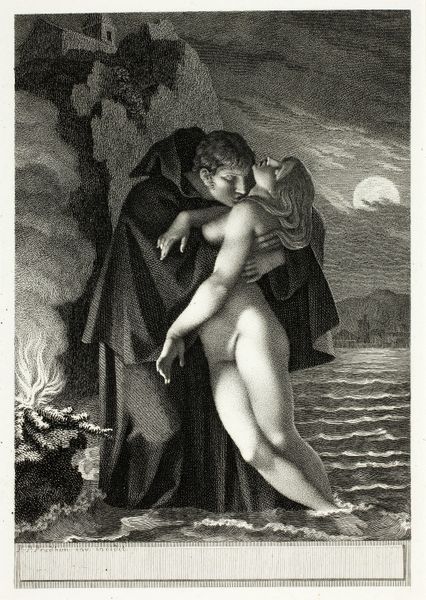 Editor: So, here we have Pierre-Paul Prud'hon’s "Phrosine et Mélidore," an engraving from 1797. I find it quite theatrical, almost like a scene from a play. It’s small and rendered in light grey tones that enhance its dream-like quality. What do you see in this print? Curator: Indeed, Prud'hon was working within a very specific historical and cultural context. Think of the French Revolution and its aftermath. Romanticism, a movement that favored emotion and individual experience over strict Neoclassical rationality, gained momentum precisely when old institutional ways of art were collapsing. How does the presentation of the figures challenge conventional heroic depictions prevalent before the revolution? Editor: I guess it is because they seem so vulnerable, not idealized heroes at all. Curator: Exactly! The figures' intimacy and the wild, somewhat chaotic landscape mark a rejection of the stoic, civic virtue that defined much pre-Revolutionary art commissioned by institutions and aristocrats. Note the medium: this work could be reproduced and dispersed widely. It allows access to those beyond the formal galleries and salons controlled by the Academy, spreading its new visual language into broader segments of French society. Who were the consumers of such work at the time, and why would this theme resonate with them? Editor: Perhaps the print appealed to a burgeoning middle class with newfound access to art and narratives focused on individual emotions rather than grand historical events. The nude woman definitely hints at a changing role for art and taste as well, one becoming more liberal… Curator: Precisely. So, how does this viewing impact your original impression? Editor: Seeing it in the light of those social changes and political unrest of that period certainly adds to the original observation, I realize now I can not unsee that cultural layer. Curator: Exactly. And now we see the piece beyond personal impression, we understand it as a social product that reflects shifts in society, power, and access to visual culture.