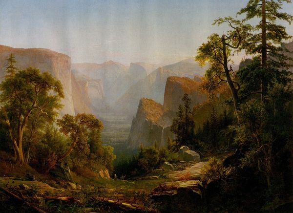 Thomas Moran made this watercolor on paper to depict the Valley of Babbling Waters in Southern Utah. With thin washes, he builds up the color to create a sense of depth and light, typical for landscapes from this period. Moran's application of watercolor demonstrates control over the materials and is remarkable for its time. Look closely, and you’ll see how the white of the paper shines through, especially in the peaks of the distant mountains. This shows how he carefully built up the painting layer by layer. He also allowed the fluidity of the paint to dictate the forms that emerge. The soft edges and blending of colors create an ethereal quality, emphasizing the sublime beauty of the natural landscape. The social context of this painting is tied to the expansion of the American West and the growing interest in its unique landscapes. The use of watercolor allowed for easy transportation of materials and quick execution of sketches, making it ideal for artists documenting these remote regions. In the end, Moran's work speaks to the cultural fascination with nature, and the artistic exploration of new territories during a time of industrial and social change.