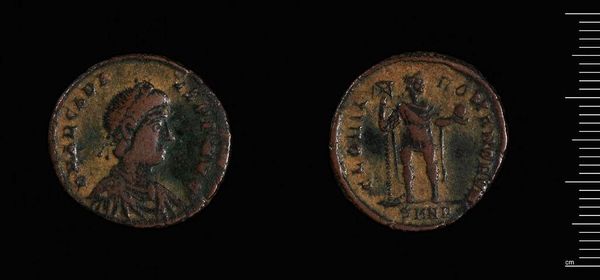 Curator: This is a sestertius of Antoninus Pius, currently housed at the Harvard Art Museums. It's a bronze coin, quite worn, showing the emperor's profile. Editor: It feels weighty, both literally, at 24.45 grams, and figuratively. The portrait and aged patina evoke a sense of enduring power and history. Curator: Indeed. One side features Antoninus Pius, who ruled with a reputation for wisdom and peace. The other shows a standing figure, likely a personification of a virtue or deity associated with his reign. Editor: It’s fascinating how this small object served as a tool for propagating the emperor’s image and ideology across the Roman Empire. It made power tangible, accessible. Curator: Coins like these weren't just currency; they were miniature billboards, carrying carefully chosen symbols and portraits. The act of exchanging it was a repeated act of bearing witness. Editor: In a way, it’s a haunting reminder of how empires use art for propaganda and control. The past, as embodied in the coin, continues to speak about power structures. Curator: It does make one consider the long echo of Roman authority and its influence on systems of power today. Editor: Absolutely. Even in decay, it tells a story.