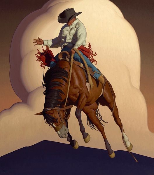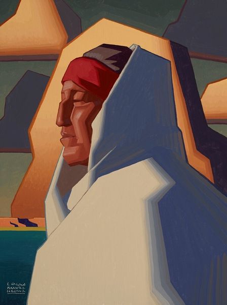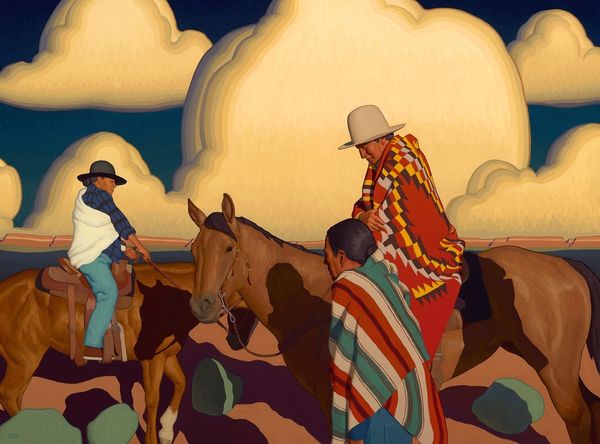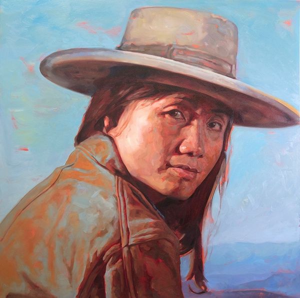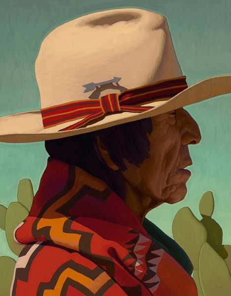 Logan Maxwell Hagege, born in 1980, made this painting with oil on canvas. The artist chose traditional materials in order to depict a Native American subject in a modern style, bridging painting traditions with depictions of Native American life. The smooth surfaces and careful blending of hues in the sky, cloud, and hat demonstrate a mastery of oil painting techniques, while also speaking to the cultural significance of textiles and adornment. The hatband, referred to in the title, is decorated in a light-colored fabric, adding an element of craft and design to the composition, while the blanket wrapped around the sitter adds to the social context, and suggests cultural traditions of the subject's heritage. The artist's material choices, combined with his attention to detail and composition, result in a contemplative, yet dynamic, exploration of cultural identity and representation, challenging traditional distinctions between fine art and craft.