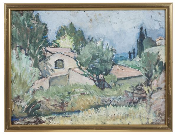 Curator: What strikes you first about Pinchus Kremegne’s “Paysage du Midi”? It's an oil painting rendered with visible brushstrokes. Editor: The color palette. It's predominantly muted greens and browns, which evokes a kind of peacefulness, but almost to the point of melancholy. It’s quite grounding. Curator: Interesting observation. Focusing on the compositional aspects, notice how the artist employs layered brushwork to build up the forms of the landscape – the trees, the structures – lending a palpable texture to the surface. There's an interesting tension created by this dense impasto. Editor: I’d argue this impasto speaks directly to Kremegne’s roots in the interwar period, during which we witnessed a global yearning for authenticity and an artistic move away from the purely avant-garde back to Realism in landscape, with its implication of the people’s recovery from societal damage. It's like feeling the very earth between your fingers. Curator: Yes, but I think we should look at how he creates a sense of depth. The relative looseness with which objects are described imbues the objects within this southern landscape with dynamism through the manipulation of shadow and light. Look how Kremegne uses similar tonalities of ochre and brown in the architecture as he does with the terrain beyond. The semiotics almost suggest nature blending with this countryside dwelling; they're not fighting for space. Editor: Kremegne himself experienced periods of hardship during the wars; maybe his artistic choices reflect the collective identity seeking comfort. What do you suppose his patrons were reflecting upon during those uneasy times? Curator: An insightful question! But Kremegne gives viewers an experience – one of visual immediacy coupled with formal understanding of color values. What can we conclude about Kremegne’s intentions then? Editor: I take from this a subtle yet potent statement on resilience through the familiar; history reveals our psychological desires in the face of what would otherwise leave a devastating mark. Curator: A wonderful note to end on—it is clear Kremegne's structural acuity and sensitive awareness creates for the viewer something more powerful than Realism, despite its commitment to such forms.