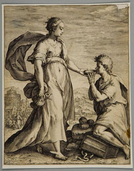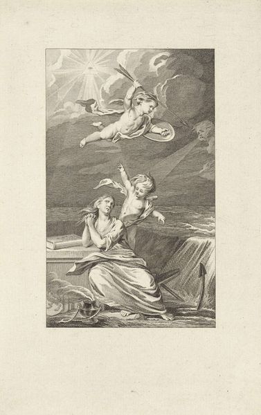 Editor: This is "Minerva Beschermt de Nederlandse Maagd" from 1815-1816 by Reinier Vinkeles, a print, currently at the Rijksmuseum. It seems to represent some sort of allegory with strong neo-classical undertones, and I'm curious, what do you see when you look at this piece? Curator: Well, consider the physical process of engraving, the labour involved. Vinkeles used a burin to carve lines into a metal plate, layer upon layer, wiping ink across the surface, transferring the design to paper. It’s not just a picture; it’s a record of labour. The materiality is essential. What kind of paper do you think he might have used? Was it readily available? Editor: Probably whatever was the common paper available at the time for printmaking? Was there any sort of paper shortage that might have made the work difficult to create? Curator: Precisely! Think about the socio-economic context. This print wasn't just made in a vacuum. The Napoleonic Wars had just ended. It speaks directly to Dutch identity in the aftermath, depicting the Netherlands as the 'Maagd', a virgin, needing protection. Who are the consumers of these prints? What were they hoping to obtain from purchasing and viewing such artworks? Editor: So, the print isn't just art, but a product of its time, reflecting the political and economic landscape through its materials and means of production? And who it was aimed at would reflect its success? Curator: Exactly. Neoclassicism here isn’t just about aesthetics. It is a conscious reference, linking the newly formed Kingdom to the glory of the ancient republics. Look at the French Eagle as an emblem of threat and consider the role of such mass-produced imagery in fostering national sentiment, turning simple materials into tools of political rhetoric and social identity formation. Editor: I never considered prints this way! So it's less about individual genius and more about a network of resources, labour, and social meaning expressed through a particular artistic technique. Curator: Precisely, now how can we re-evaluate its legacy today in the grand scheme of art production and material appreciation?
