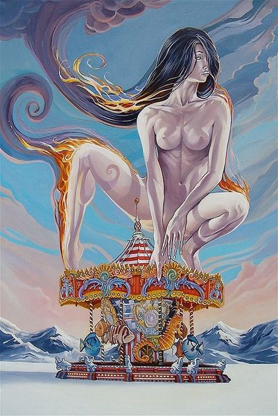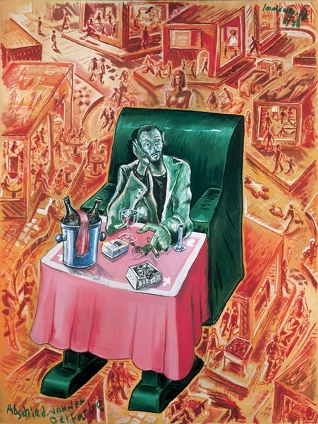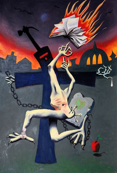 Editor: This is Dave MacDowel's, “Lord of the Onion Rings,” an acrylic painting that feels… strange. I mean, it’s a pop-surrealist portrait of Gollum from Lord of the Rings, but he's wearing a “Booger King” crown and holding a tray of fast food. What’s going on here? What do you make of this piece? Curator: Oh, it’s wonderfully grotesque, isn’t it? At first glance, it's a playful subversion, a clash of high fantasy and fast-food culture. But, look closer. The “precious” ring is now an onion ring, shimmering with a divine light in the background – a new object of unhealthy obsession. Editor: Right, there’s a definite obsession vibe, a critique of consumerism maybe? Curator: Perhaps, but also consider the deeper resonances. Gollum, consumed by his desire for the Ring, now embodies our own insatiable cravings. That burger, those fries… they become symbols of our own weaknesses. Is it cultural commentary or a mirror reflecting our collective, guilty pleasures? And who is "Booger King"? The pun feels deliberate and adds a humorous but ironic dimension. Does that reading resonate with you? Editor: It does. I see now how MacDowel layers satire with something darker about desire and, like, the junk we consume, both literally and metaphorically. Curator: Exactly! It’s an invitation to confront the ‘Gollum’ within ourselves, wrestling with our own "precious". It’s clever and very funny when you realize you have similar struggles in your real life. Editor: I hadn’t thought about it that way. This definitely changes how I see both the painting, and maybe even my next fast-food meal! Curator: Indeed! Art, like a good onion ring, can be surprisingly layered. It’s often funny until it’s true.
