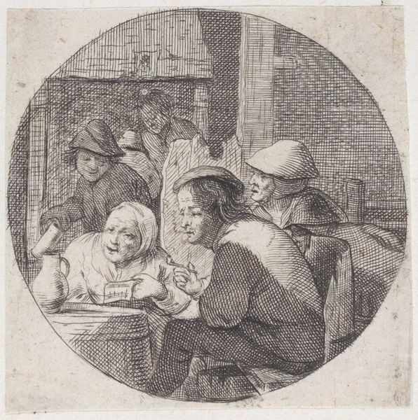 Curator: This small etching, titled "Interior with a Smoker," is by an anonymous artist and resides here at the Harvard Art Museums. What strikes you first about it? Editor: It feels so wonderfully grimy! The composition is like a boisterous whisper, capturing a moment of unfiltered, smoky camaraderie. Curator: Indeed. Tavern scenes like this were incredibly popular, often used to comment on social behaviors and hierarchies. The printmaking process allowed for wide distribution. Editor: It's like catching a glimpse into a secret world, all the rough textures and huddled figures—you can almost smell the stale beer and tobacco. Curator: Precisely. Consider the artist's choice to frame the scene within a circle, drawing our eyes into this close-knit, perhaps even illicit, social gathering. Editor: You know, it makes me think about our own hidden rituals, the little rebellions that bring us together. It's timeless, really. Curator: Absolutely. I'm constantly fascinated by how art allows us to explore these shared human experiences across time and cultures. Editor: And for me, it's that raw feeling, that unpolished truth—that’s what makes it stick.