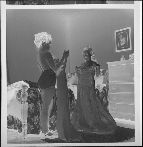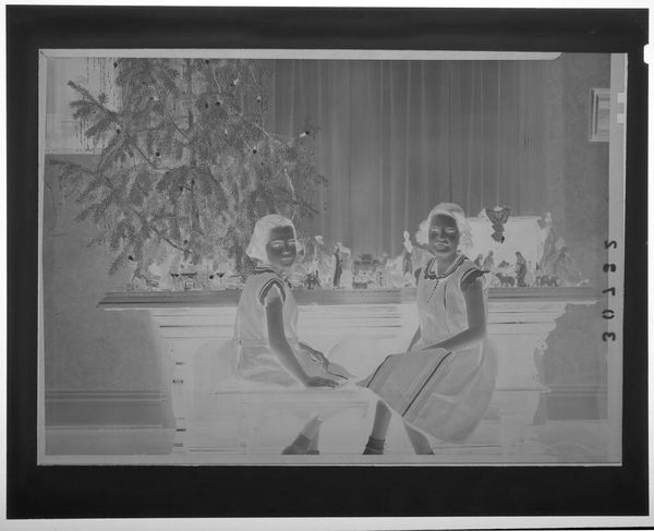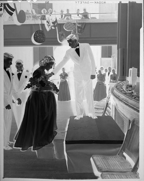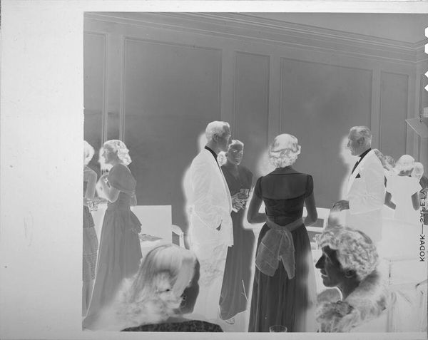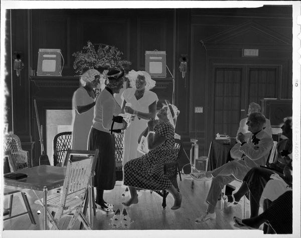 Curator: This photograph, of unknown date, by Lucian and Mary Brown, shows people in formal attire on folding chairs. Editor: It strikes me as a very intimate scene, almost a captured moment of private celebration, marked by the way the figures are arranged and the light filters through the room. Curator: Indeed. The informality of the folding chairs contrasts with the formality of their clothing, perhaps suggesting a community event held in a domestic setting. The power of images in representing social gatherings. Editor: Agreed. And the strategic use of light—how it falls unevenly, creating stark contrasts—highlights certain figures and obscures others, drawing our eye to specific points of interest within the composition. Curator: It also may subtly comment on social hierarchies within the community, or access to resources, which can be powerfully conveyed via photographic media and their display. Editor: Precisely. The stark black and white tones further heighten the image's dramatic effect, lending it an almost timeless quality. Curator: A fascinating piece, underscoring the nuances within representations of community life. Editor: A compelling study in contrasts and compositions—and the power of light to shape our perception.