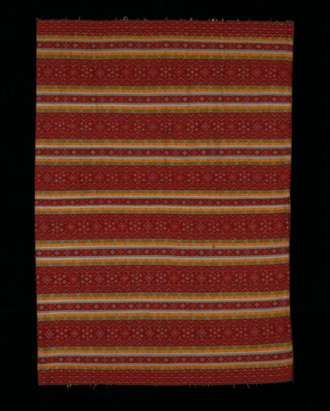 Editor: This beautiful woven textile, a coverlet from 1842 by Leonard Metz, is at the Metropolitan Museum of Art. The density of the repeated floral and geometric patterns is stunning, a real feast for the eyes. What can you tell me about this piece? Curator: This coverlet provides a fascinating glimpse into the socio-economic landscape of 19th-century America. What do you notice about its construction, particularly where it says, "Made by?" Editor: Well, it says, "Made by Metz, Ontigo Mery. Co.," so it seems pretty explicitly marked as a product. Curator: Exactly. We see the rise of manufactories being proudly advertised. This piece is a textile but it also shows us a key transition. Before, these intricate weavings were made within the domestic sphere. Now, the "Mery Co." suggests factory production. How does knowing it was factory-produced impact your view of the intricate designs? Editor: I suppose it takes away some of the "folk art" charm. It feels less personal, perhaps more commercial. Does the pattern itself offer insights into its intended market? Curator: Certainly. The geometric patterns, the symmetrical floral arrangements, and even the bold colors were all calculated to appeal to a rising middle class seeking to display their prosperity and taste. These objects offered a visual language for expressing newly acquired status. We need to think of how folk art and factory objects mixed. Editor: So, it’s not just a pretty coverlet, but a statement about societal shifts. Thinking about the audience and manufacturing really changes how I see it. Curator: Precisely! It’s a powerful reminder that art is deeply embedded in social and economic currents.