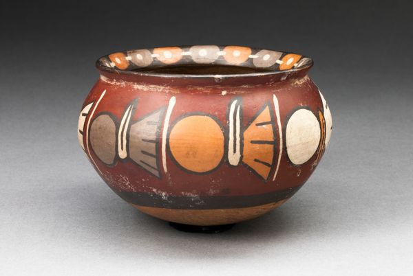 Editor: Today we're looking at a terracotta bowl from the Nazca culture, dating from around 180 to 500 AD. It's called "Bowl Depicting Abstract Plants, Probably Cactus", and its surface is decorated with bold geometric patterns. There's a primal feel to the piece that’s immediately captivating. What's your take on this enigmatic work? Curator: It whispers stories, doesn't it? I find myself drawn to the implied landscape within its curves. It feels like a memory of the desert, distilled into this compact form. Think about the artist – a conduit channeling the spirit of the land, using ochre hues and geometric motifs like a poetic language. And those 'abstract plants', maybe cactus… or maybe something only dreamt of under a scorching sun. Do you get that feeling of latent energy? Editor: Absolutely, a potent simplicity! Those repeated shapes and stark contrasts… Is that sense of rhythm intentional, maybe linked to rituals? Curator: Rituals, definitely! Daily life too. Imagine it filled with offerings, perhaps water shimmering like a mirror of the sun. It makes me wonder about the narratives it silently carried within ancient Nazca ceremonies, wouldn’t you agree? Each dot, each line, becomes a verse in their story. What story do you think this object tries to convey? Editor: I love the idea of it filled with water, reflecting the world! This reminds me that even seemingly simple forms hold complex histories and meanings. Thanks, that brought this piece alive in a totally new way. Curator: My pleasure! Art invites us to be wanderers, to inhabit the minds of other civilizations. Isn't that the greatest adventure of all?
