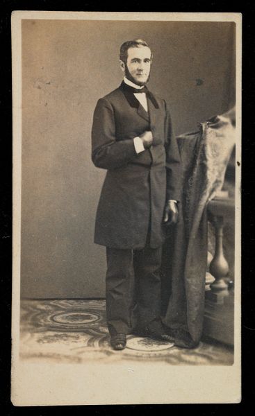 Editor: Here we have an undated portrait of a man by Mathew Brady, captured using photographic materials. He seems so self-contained. What do you notice in this image? Curator: The sepia tones lend it an air of quiet dignity, don't they? I'm drawn to the subtle details – the way he holds his hat, the slight asymmetry of his stance. It feels like a glimpse into another era, a whispered story. Perhaps a returning soldier, posing after the war? Editor: I hadn't considered that. There is a certain somberness to the image. It definitely makes you wonder about the stories that lie behind the surface. Curator: Exactly! Art, like memory, is often a collage of fragments. It invites us to complete the narrative. Editor: I'll remember that. Thanks!