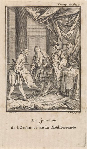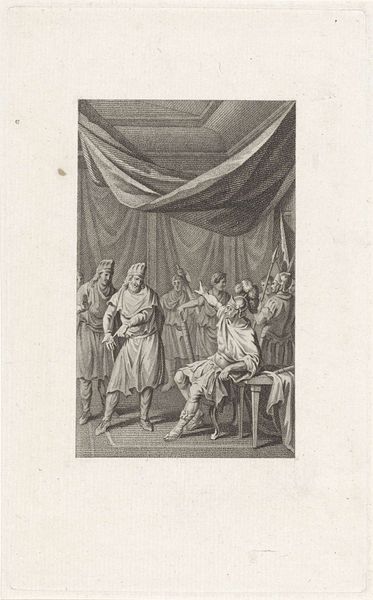 This engraving by Ludwig Gottlieb Portman captures a scene of formal encounter. The composition is structured by a clear division between the regal setting on the left and the approaching figures on the right. The king under his canopy becomes a focal point, framed by the architectural elements of the court. The linear precision in Portman's technique defines the figures and drapery. The texture of the clothing and the stone work add depth to the scene. The arrangement of figures, almost in a frieze, guides the viewer's eye across the narrative, engaging with power and diplomacy. It invites us to consider how the setting and body language convey status, as well as the role of visual representation in constructing narratives of authority.