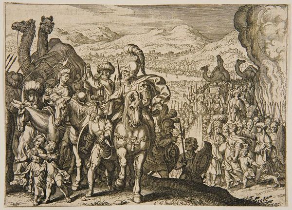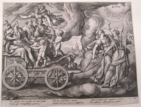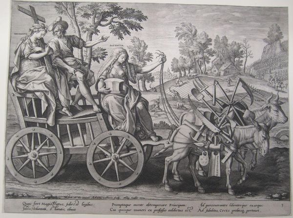Editor: This is Adriaen Collaert's "The Task of the Worldly Power." It's a print, and the detail is incredible. It looks like it's depicting a triumphant procession. What strikes me most is the ornate carriage and the somewhat unsettling image of Justice herself. What do you see in this piece? Curator: I'm drawn to the printmaking process itself. Consider the labor involved in creating this intricate design. Each line, each texture was carefully etched. What materials were used? Who commissioned it, and what was its purpose within the broader social context of 16th-century print culture? Editor: So, you're less focused on the figures and more on how it was made and distributed? Curator: Precisely. The image becomes a commodity, a product of specific social and economic forces. How does this change our understanding of 'worldly power'? Editor: I never thought about it that way, considering the physical production as part of understanding power. Thanks! Curator: Indeed, materiality shapes meaning. It allows us to move past the surface-level symbolism and to consider the art as a product of labor and consumption.