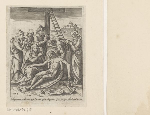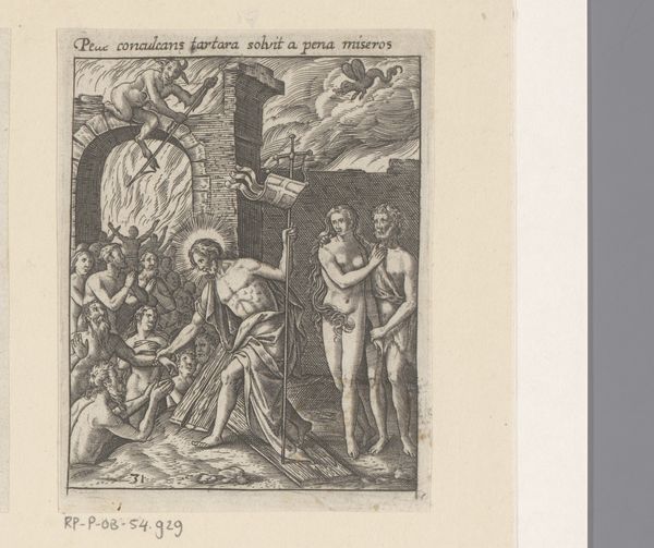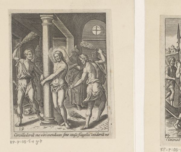 This print, "Ecce Homo," was created by Heinrich Ulrich sometime around the late 16th century. Ulrich uses engraving to construct a scene dominated by the architectural backdrop and the rigid figures surrounding Christ. Notice how Ulrich employs a precise, linear style to define forms and textures. The stark contrast between light and shadow sculpts each figure, accentuating their expressions and the folds of their garments. The strategic use of hatching and cross-hatching creates a sense of depth within a very limited space, intensifying the emotional weight of the scene. The figures are carefully arranged to lead our eye toward Christ, who stands almost ethereally amidst the angular lines and assertive poses of the surrounding men. This focus on the structure of the composition and the linear qualities invites us to consider not only the narrative but also the formal means by which Ulrich conveys the gravity and the solemnity of the moment. The artwork is a visual statement about power, vulnerability, and the act of seeing itself.