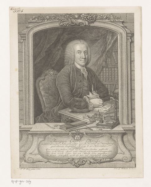 Editor: This is "Portret van Friedrich Binder von Krieglstein," made between 1749 and 1796 by Johann Ernst Mansfeld, an engraving, so incredibly detailed. It feels very formal and… official, almost intimidating. What do you make of it? Curator: Intimidating, you say? Hmm. It whispers of powdered wigs and hushed political whispers. The Baron seems caught between worlds, doesn’t he? This almost theatrical rendering feels very baroque in its opulence but his pose, almost defiant in its stillness, leans into the classical. He’s holding what looks like official documents – secrets? Declarations? Mansfeld's rendering makes me wonder, what are you *really* thinking? Does his clothing imply more than his face does? Editor: That’s fascinating – I hadn’t really considered the clothing. How does that elaborate dress speak to the moment? Curator: Precisely! Those ornate details, the lace, the embroidery, they speak to status, of course, but also to a specific code of behaviour. He's not just wearing clothes; he's wearing power. He is hiding behind them. Now look at the folds in that drapery behind him... Doesn’t it feel staged? What do you make of that stiff backdrop? Editor: Good point! It contrasts really strongly with the, sort of, ‘living’ texture of the Baron’s coat. Almost like the backdrop is just… expected. Curator: Exactly. Expected, *demanded*, even. A stage on which the Baron must perform. These clues make me think how the weight of duty is pressing down, hiding his interior life. He's in service to the machine of power. How terribly tiring for him! Editor: I never thought I’d feel sorry for a baron. I’ll definitely look at engravings differently now. Curator: Precisely, the joy of discovery.