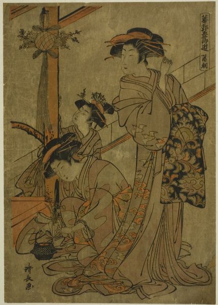 Editor: This woodblock print is called "The Secret Love Letter" by Suzuki Harunobu. There isn't a specific date, but Harunobu was active in the mid-18th century. It feels so intimate, like we're peeking into a private moment. What can you tell me about this piece? Curator: It’s a beautiful example of Harunobu's work, known for its depiction of daily life. What strikes me is the level of detail Harunobu includes, offering us insights into the rituals surrounding letter writing and gendered social roles. Notice how the presence of the sleeping figure in the background shapes our perception of the woman reading the letter. What do you think that implies? Editor: Maybe it hints at the complexities and restrictions women faced, even in private moments? Curator: Exactly. The act of reading and writing becomes a site of negotiation, reflecting both personal agency and societal constraints. These prints played a vital role in shaping cultural ideals. Editor: It's amazing to consider how art can reflect and influence the social norms of a time. Thanks!