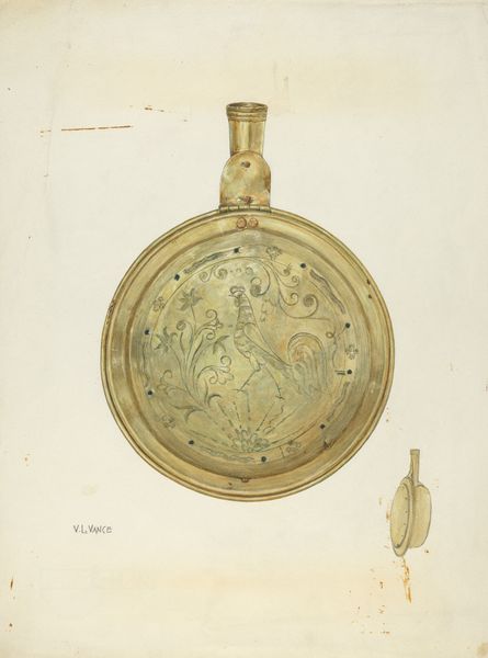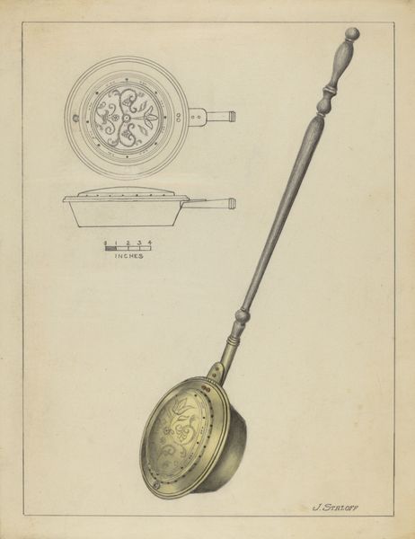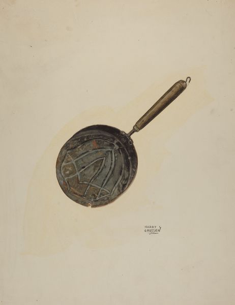 This Warming Pan was made by Karl Joubert in the 20th century, although the exact date is unknown. Joubert meticulously rendered this household item in a medium that seems at odds with the object itself, as he used graphite and watercolor on paper, rather than metal and wood. Warming pans were typically used to warm beds in the centuries before central heating. Filled with hot coals, they were slid between the sheets, a domestic ritual that speaks to gendered labor and the making of a home. While seemingly straightforward, Joubert's artistic choice elevates an object of domesticity into the realm of art. This challenges conventional notions of what is deemed worthy of artistic representation and prompts us to reflect on the value we place on everyday objects and experiences. Joubert invites us to consider the quiet dignity of domestic life and labor.