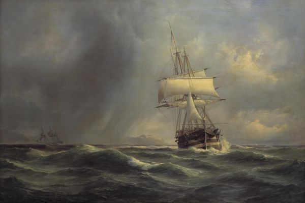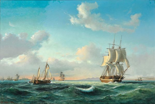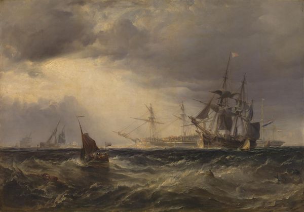 Editor: Here we have "The Capture of Sevastopol," painted in 1855 by Ivan Aivazovsky using oil paints. The sheer scale of it is breathtaking, and you can almost feel the chill of the sea air. What can you tell me about it? Curator: I'm struck by the labor embedded in this depiction. The artist meticulously rendered each wave, each ship—consider the immense effort to produce the pigments, weave the canvas, construct these vessels. War wasn't only waged with steel, but with the combined exertion of countless hands. Editor: That's an interesting point. It's easy to get lost in the drama of the battle and forget about the actual human labor involved. Curator: Exactly. Aivazovsky, as a court painter, crafted this heroic scene. But through a materialist lens, it prompts reflection on power dynamics. Who profits from the means of production, the building of ships, and ultimately, the waging of war? What resources were diverted? Editor: So, looking at the materials and their origins tells a much broader story than just the event itself. How does Aivazovsky's technique contribute? Curator: The shimmering surface achieved through oil paint elevates the scene but also conceals. The romanticism, almost glorifying the war, can be seen as propaganda. Examining the social context unveils that it was a period of immense state control of art production and the manufacturing sector supporting naval advancement. The art serves to bolster power. Editor: I hadn't considered the link between artistic style and political messaging so explicitly. I always focused on the technical skill first. Curator: By looking at process, materiality and the networks of labor surrounding "The Capture of Sevastopol," we gain critical insights beyond its aesthetic value. Editor: Thank you for sharing these novel ideas. It helps one delve much deeper into understanding an artwork's profound significance.