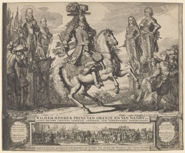 Editor: Here we have "De Dioscuren" by Antonio Tempesta, created sometime between 1565 and 1630. It’s an engraving printed on metal and housed in the Rijksmuseum. There's something so striking about the way the human figures and horses mirror each other, and how everything is arranged so symmetrically. What’s your perspective on this piece? Curator: It’s a fascinating print precisely because of that rigid symmetry and the grand pronouncements about artistic rivalry inscribed at the bottom. Think about this image circulating amongst an elite 17th-century audience steeped in classical history and contemporary artistic debates. Tempesta's print acts as a visual argument about cultural authority, doesn’t it? Editor: Cultural authority? Can you expand on that? Curator: Certainly. Consider the prominent display of Latin text. The inscriptions directly reference not only Phidias and Praxiteles – celebrated sculptors of antiquity – but also Pope Sixtus V and his restoration of Roman monuments. This positions the papacy as a champion of classical ideals and a patron of artistic excellence. Don't you think this elevates the standing of Rome at a time when its cultural dominance was being challenged by other European powers? Editor: I see what you mean. The Pope is actively shaping Rome’s image through art. So, this isn’t just a depiction of classical sculpture, but a statement about the power of institutions to shape narratives? Curator: Exactly. This image reflects how institutions used and continue to use art to bolster their public image. Furthermore, look at how meticulously Tempesta renders every detail. It is not merely showing you the statues; he is showing you the active reconstruction and reinterpretation of a past, presented for a very particular present. Editor: It’s amazing how a print of some statues can be so loaded with political meaning. Thanks, that's a completely different perspective. Curator: My pleasure. Seeing art through its historical context often reveals layers we might otherwise miss.