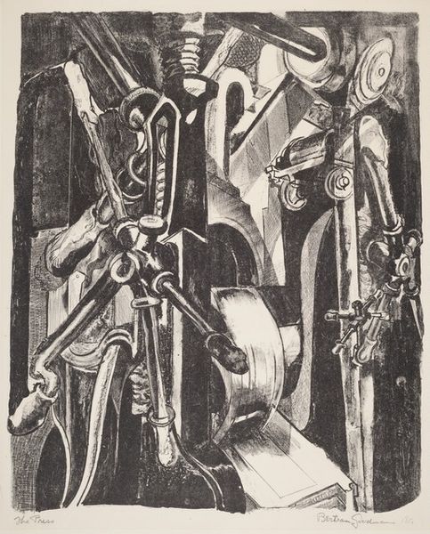 Curator: Elizabeth Olds' print, "Bootleg Mining, Pennsylvania," created in 1936. It’s a compelling charcoal drawing depicting… well, what strikes you first about this image? Editor: A sense of oppressive, claustrophobic labor. The diagonals are so aggressive, pinning the figures into the composition as if trapped within the mine itself. It's visceral, I feel a tangible anxiety radiating from it. Curator: Olds made this during the Depression era; bootleg mining emerged when unemployed miners illegally extracted coal from abandoned mines. It highlights the desperation and ingenuity born from economic hardship, and how communities mobilized to survive. We see her use of charcoal really emphasize the grit of the situation, down to the textures of tools and raw landscape. Editor: Absolutely. Consider charcoal itself, a byproduct of burnt organic matter – its creation mirrors the destruction and subsequent exploitation depicted in the scene. Notice the almost classical "Madonna of humility" pose one figure in the background, bent double as they scrabble through the spoil. It contrasts sharply with the industrial apparatus. A clear comment on value versus worth. Curator: Right, these figures take on a mythical, almost tragic status within this scene of raw materials and manual labor. Olds' social-realist style sought to represent everyday people engaged in the mundane struggles of their existence, while drawing our attention to their capacity to reshape their material conditions, albeit in a struggle. The bootleg miners rework the remnants of the mechanized industries. Editor: The recurring images of containers--the wheelbarrows, the rectangular boxes--- underscore that sense of striving, of transporting the raw material. It all points back to human need. In what feels like a deliberately destabilized perspective. They have become ciphers, barely visible bodies operating this mechanism of recovery. Curator: And that sense of precariousness! The whole scene looks as if it might collapse under its own weight – both literally and figuratively, referencing that very real instability in their material lives. This work invites reflection on the costs and implications of extraction, a powerful act of defiance inscribed in charcoal dust. Editor: A haunting portrait, revealing the stories woven into the very landscape, and reminding us that symbols of labor resonate profoundly across eras. The black and white gives a somber emotional context to how humans transform a natural setting. Curator: An evocative interplay of creation, desperation, and the human spirit rendered in the shadows of survival, reminding us to consider where, how and by whom essential materials are made accessible to a broader audience.