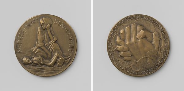 Editor: This is a bronze relief sculpture entitled "400ste Geboortedag Willem van Oranje" by Oswald Wenckebach, created in 1933. The round shape and the use of bronze give it the feel of a commemorative coin, and it is striking to me how much the kneeling figure on one side contrasts with the bird nesting peacefully over the water on the other side. How do you interpret this work? Curator: The stark contrast is precisely where the artwork's power lies. Given its creation in 1933, during a period of rising nationalism and anxieties surrounding identity, this piece presents a potent narrative. On one side, we see William of Orange in a posture of supplication. What does it mean to portray a historical figure, typically lionized for their strength, in such a vulnerable state? Does it humanize him or does it perhaps hint at the burdens of leadership, especially in a time of uncertainty? Editor: That's a great point. I had thought about the kneeling figure only in the religious or devotional sense. What about the other side, with the nesting bird? Curator: Ah, the imagery of the bird—perhaps a seagull, given the presence of water—offers a compelling counterpoint. Consider the inscription "saevis tranquillus in undis" – "Tranquil in turbulent waters." This, paired with the symbolism of the nest, speaks to a desire for peace, stability, and hope amidst societal storms. Do you see the inherent tension between these two sides as reflective of the sociopolitical climate of the time? The Netherlands, like much of Europe, was on the precipice of great upheaval. Editor: I do. It makes me think about how even in times of national celebration, there can be underlying currents of unease and longing for stability. It's not just a simple heroic image. Curator: Exactly! By juxtaposing vulnerability and the aspiration for peace, Wenckebach’s relief becomes a powerful meditation on leadership, national identity, and the yearning for tranquility in an increasingly unstable world. We should reflect on what national pride means while remembering the less powerful among us. Editor: I learned to consider both national narratives and critical intersectional analysis, which greatly expanded my understanding!