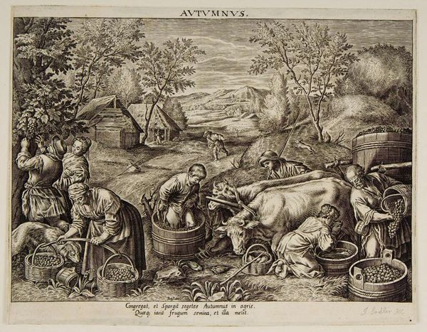 Curator: This engraving, “Summer,” by Johann Sadeler I presents a fascinating view of 16th-century agrarian life. Editor: It’s so detailed! There are so many figures, all engaged in different activities. It feels almost like a snapshot of daily life. What’s your take on why Sadeler chose to depict summer in this way? Curator: Well, consider the socio-economic context. These "seasons" prints served a vital public function. They reinforced the rhythm of the agricultural calendar, subtly teaching the value of hard work to its viewers and promoting their subservience within that hierarchy. Editor: So, it’s not just a pretty picture? It’s actually reinforcing societal norms? Curator: Precisely! The seeming idyllic scene masks the realities of peasant labor, transforming labor into a symbol of social order. The viewer is subtly guided towards accepting the prevailing social structure as natural and desirable. Editor: That's a lot to unpack from one image! I never would have considered that.