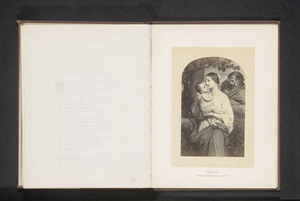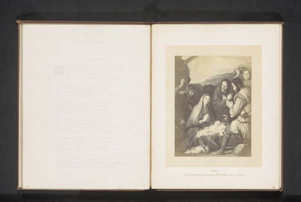 Editor: Here we have an interesting reproduction, predating 1871, of a painting called "The Visitation" by an anonymous artist. It’s presented as a print within a book. The aged paper gives it a real sense of history. I'm struck by the contrast between the delicate figures and the bold, almost crude, engraving style. How do you approach a piece like this? Curator: Well, I'm immediately drawn to the means of its production. The fact that it’s a reproductive print tells us so much about its intended audience and its function. It served as a way to disseminate religious imagery widely, making art accessible to a broader public beyond the elite who could commission original paintings. Notice the quality of the paper. How does its texture and the evident signs of age play into your understanding? Editor: I see what you mean. It adds to the authenticity somehow, knowing it’s survived so long. It feels more "real" than a pristine modern copy, even if it's a reproduction. It speaks to a certain craftsmanship of a bygone era. It makes me think, what kind of labor was involved? Curator: Precisely. Consider the engraver’s skill – translating the nuances of a painting into the graphic language of lines and shading. That labor, often anonymous and undervalued, was essential to the circulation of these images and their impact on religious culture. What statement can you derive about religion? Editor: Hmmm, the book presentation itself emphasizes the commodification and accessibility of religion, making faith almost like a product, available for personal consumption. This has an almost democratizing influence for Christianity and challenges elitist practices of its earlier origins. Curator: Exactly! It also challenges the idea of high art. It existed within the everyday context of a book and became a tool for instruction and contemplation, reflecting the material conditions of its creation and use. It’s a beautiful blend of artistry, production, and consumption all wrapped into one artifact. What else? Editor: I hadn't thought about it that way before, really digging into the “how” and “why” of its making. Now I'm appreciating this object in a completely different light! Curator: Indeed! By examining the materials, the production process, and the context of consumption, we can unlock a far richer understanding of its cultural significance and relevance.