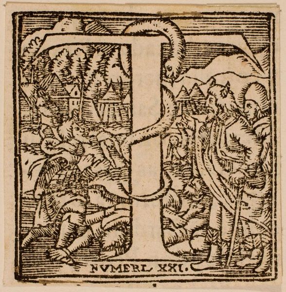 Editor: Here we have an interesting initial "P," simply titled "Letter P," by an anonymous artist. The print depicts the biblical story of Daniel in the lion's den. What do you see in this piece, and how might we understand it beyond its immediate visual narrative? Curator: This "Letter P" offers a lens to examine power dynamics between the individual and institutions. Daniel, a figure of resistance against unjust laws, is saved by his faith. The lions, symbols of state power, are rendered harmless, revealing the potential for the oppressed to subvert dominant ideologies. Editor: So, it's a commentary on resisting oppressive systems through faith? Curator: Precisely. How does this image resonate with contemporary struggles against systemic injustices, such as racial inequality, gender discrimination, and political repression? Editor: It's fascinating to see how a seemingly simple letter can be such a potent symbol of resistance and hope.