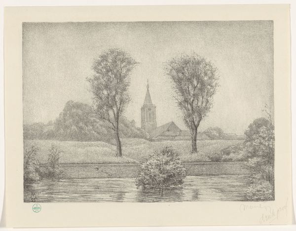 Curator: This is Jean Pierre François Lamorinière's "View of a Castle on the High Left Bank of a River," created between 1838 and 1911. It's an etching currently housed here at the Rijksmuseum. Editor: It's very evocative, immediately suggesting stillness and perhaps a touch of melancholy with its muted tones and slightly obscured castle. The scale feels quite intimate too, doesn't it? Curator: The intimacy likely stems from the etching process itself. Think about the labour involved – the deliberate, repetitive action of scoring the plate to achieve these delicate lines and gradations of tone. Also, what sort of economic relationships and conditions were needed for artist and etching production to exist here? Editor: Agreed. And speaking of lines, notice how the artist employs hatching and cross-hatching to create a sense of depth and texture. The composition guides your eye from the reflective river, up the leafy bank, towards that almost spectral castle silhouetted against the sky. Curator: It does indeed! I’m wondering about the accessibility of this etching and others to middle-class patrons who were hungry for portable imagery to put in albums at the time. What effect might these relatively easy to copy images have had on more exclusive and luxury oil on canvas? Editor: An excellent point. And consider, too, the formal relationship between the darkness of the foliage and the relative brightness of the sky—it creates a strong contrast. This sharp contrast leads us to see what can and can’t be observed as light shapes in nature. The eye tends to find the point that is either the lightest or the darkest in the artwork in order to ground visual comprehension. Curator: We must not forget about the rise of printmaking during the industrial revolution in which landscapes could find larger audiences with less wealthy potential buyers and appreciators. Editor: Precisely. This intimate landscape is both beautiful and a compelling material artifact of its time. Curator: Yes, indeed! Thank you for adding that note.