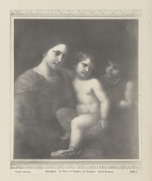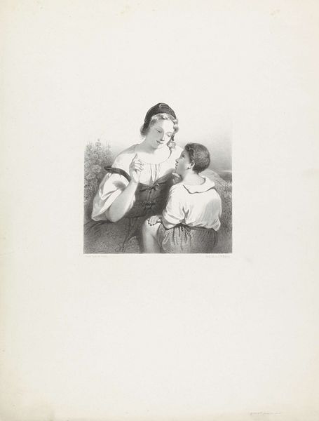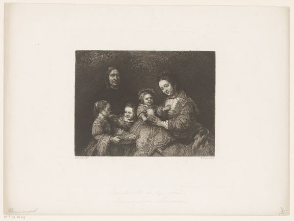 Editor: Here we have Reinier Craeyvanger’s "Vioolspelende man met vrouw en kind," created in 1858. It's a drawing, a print, made with graphite and charcoal. It feels quite domestic and staged, a captured moment in a home, and what strikes me is how clearly defined the classes of this scene seem to be by how they are drawn and presented. What can we tell about the process and materials from how this print was made? Curator: Exactly! The deliberate use of graphite and charcoal points to a stratified approach to image-making mirroring the social structure represented. Note the precision of line in the woman's dress – a clear marker of her social standing painstakingly reproduced with graphite. Now, contrast that with the looser, almost smudged application of charcoal to depict the man's clothing and even the room's background. How does the difference in rendering style influence your interpretation of power dynamics here? Editor: I see what you mean. It's like the materials themselves are used to reinforce existing class distinctions, making it seem rigid and constructed. So the artistic choices, driven by the material itself, influence the viewer's understanding. Does the choice of print, a readily reproducible medium, then challenge or support these social boundaries? Curator: An insightful observation. The reproductive nature of the print, while potentially democratizing the image's distribution, paradoxically served to reinforce these very power structures for mass consumption. What impact could this readily available depiction have had on shaping perceptions of class and domesticity at the time? Editor: So it’s a feedback loop. The materials and production methods both reflect and reinforce existing social conditions, becoming almost a form of propaganda. It really changes how I view seemingly simple domestic scenes. Curator: Indeed. By understanding the materials, labour and means of production, we gain a deeper understanding of the artwork's cultural significance.