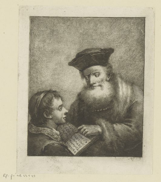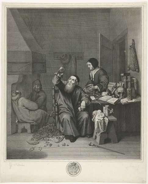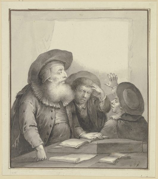 Curator: This captivating ink drawing, housed here at the Städel Museum, is entitled "Rabbi Naphtali Ben Cohen mit zwei Schülern," dating back to 1778. The piece is credited to Johann Andreas Benjamin Nothnagel. Editor: Right off the bat, it’s striking. The light almost explodes from the window, illuminating three very different reactions. One student looks terrified, the other completely flabbergasted, and the rabbi himself seems...intrigued? Curator: Nothnagel was active during a fascinating transitional period. You see elements of both the retreating Rococo style, in its dynamism and concern for depicting emotions, and Neoclassicism’s burgeoning interest in clarity and structure. It is very characteristic of the style called Romanticism too. Editor: And he uses that transition so effectively. The expressiveness of the students – you can almost hear them arguing, disagreeing – is offset by the rabbi’s relative composure. The glow overpowers every one of them. But its all contained and balanced in composition. I think I even sense some humor in it? Curator: Indeed. This work gives us a window, quite literally, into the dynamics between religious figures and their students during a time of significant intellectual and social change. We believe that this work speaks volumes to Nothnagel´s interest in representing the character and psychological state of his portrayed figures. It tells about social norms as well as education standards from that era. Editor: And the sheer intensity! The emotions on their faces are so raw. It’s as if Nothnagel wanted to capture the very moment when faith and doubt collide. Maybe the artist wondered if everyone had the right understanding of religion? Or just making us think of moments we learned about life from wise mentors? Curator: A distinct possibility! Viewing art from past eras helps us understand shifts in social power dynamics and the growing middle classes. The themes are incredibly vivid. Editor: Makes you wonder what kind of future Nothnagel hoped that group would face. Thanks for contextualizing that emotional snapshot, what a trip.