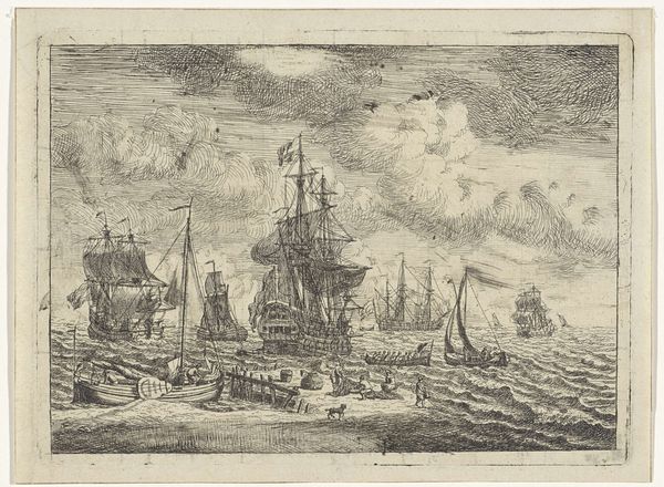 Carel van der Hem made this print of whaling ships, but we don't know exactly when. The scene depicts Dutch ships during what was a lucrative but dangerous enterprise. This image reflects the economic and colonial ambitions of the Dutch Republic. The ships are rendered with impressive detail, emphasizing their size and strength, visual symbols of Dutch maritime power. The whales, shown being hunted, represent both the natural resources being exploited and the risks involved. Whaling was not just an economic activity; it was deeply embedded in the social fabric of the Netherlands. Profits from whaling funded the construction of canals and public buildings, like the Rijksmuseum itself. Prints like these were often commissioned to promote these activities, reinforcing the dominant social values and economic policies of the time. However, today, we can also view this work as a historical document of the complex relationship between humans and the environment. To fully understand this image, we can look at archival records of the Dutch East India Company, maritime histories, and studies of Dutch colonial practices. Art is never created in a vacuum; its meaning is always contingent on its historical and institutional context.